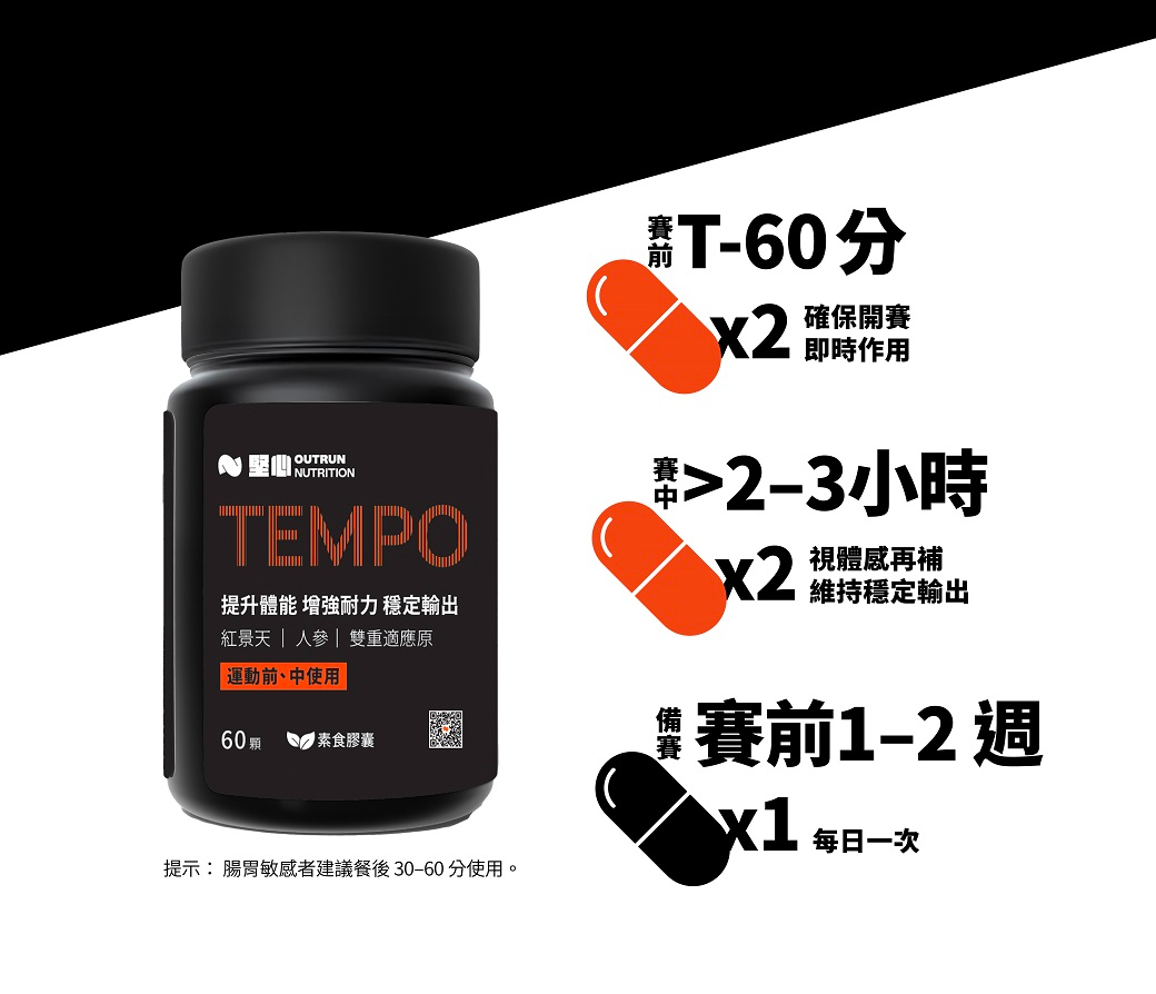 * 賽前 / 賽中皆可使用|小顆膠囊,好攜帶無負擔,路跑、越野、鐵人都適用
