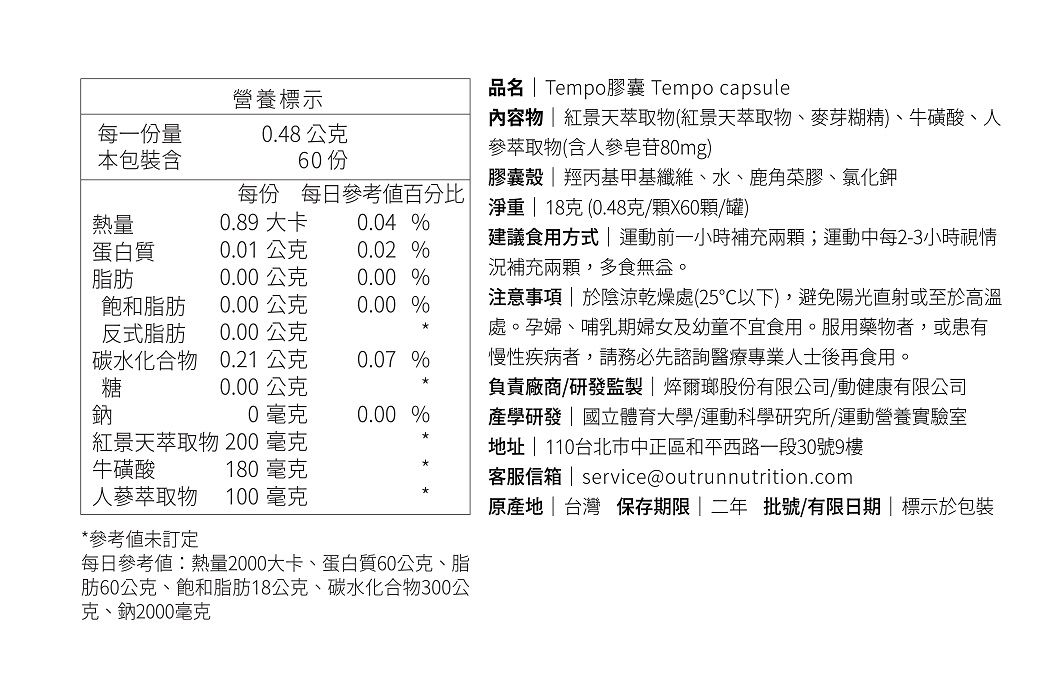 內容物:紅景天萃取物(紅景天萃取物、麥芽糊精)、牛磺酸、人參萃取物(含人參皂苷80mg)